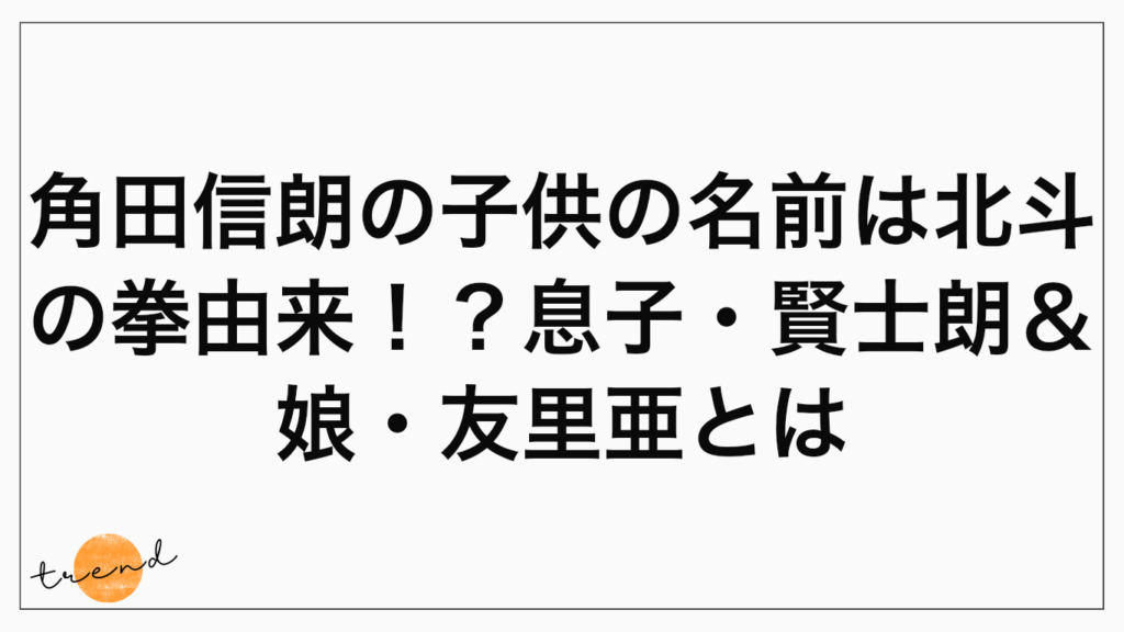 格闘技界で知られる角田信朗さん。その息子と娘の名前が、なんと有名漫画『北斗の拳』に由来していることをご存じでしょうか? 角田信朗さんの息子・賢士朗(ケンシロウ)さんと娘・友里亜(ユリア)さんの名前には、彼の熱い思いが込められています。... -